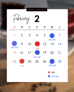 2月の休診日と矯正治療および歯並び無料相談の日程をお知らせいたします。